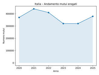 Il numero di mutui erogati nel periodo più recente registra un incremento significativo, con una crescita superiore al 16% tra il 2024 e il 2025. Questo dato indica una riattivazione della domanda di finanziamento, favorita dal graduale adattamento delle famiglie alle nuove condizioni del credito e da un contesto economico relativamente più stabile.
