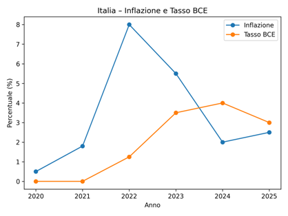 Negli anni recenti l’inflazione ha registrato un picco significativo, seguito da una fase di progressiva riduzione. Questo movimento si è sviluppato parallelamente all’andamento dei tassi della Banca Centrale Europea.